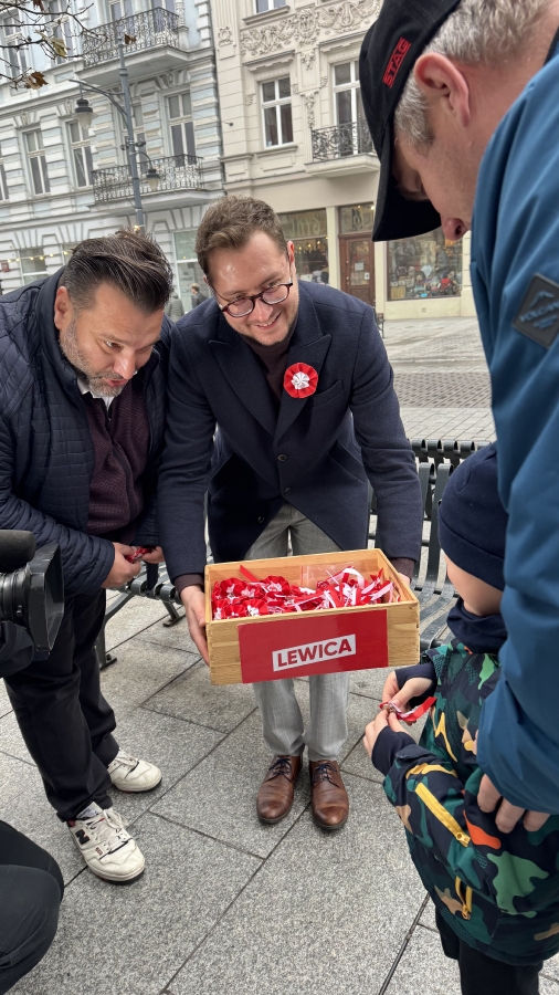 "Szanowni Państwo, jesteśmy dokładnie w przededniu rocznicy odzyskania przez Polskę niepodległości. Bardzo ważne święto, święto wszystkich obywateli, bez względu na to, czy są zwolennikami lewicy, prawicy, święto nas wszystkich. Dlatego dzisiaj z okazji tego święta będziemy rozdawać mieszkańcom Łodzi kotyliony, żeby jutro dumnie ten kotylion przyczepili sobie do kurtki, do marynarki, do swetra i dumnie pokazywali, że Polska jest niepodległym krajem". - mówił Tomasz Trela, Poseł Na Sejm RP.